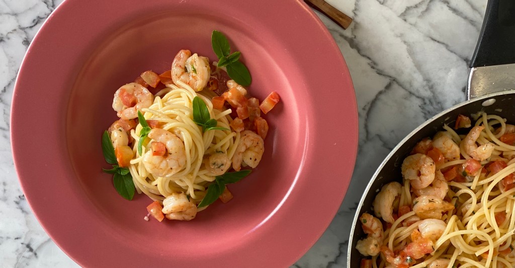 Esse prato é o equilíbrio perfeito da doçura do camarão com o umami do tomate, acidez do vinho branco e frescor do manjericão fresco envoltos pelo spaghetti.