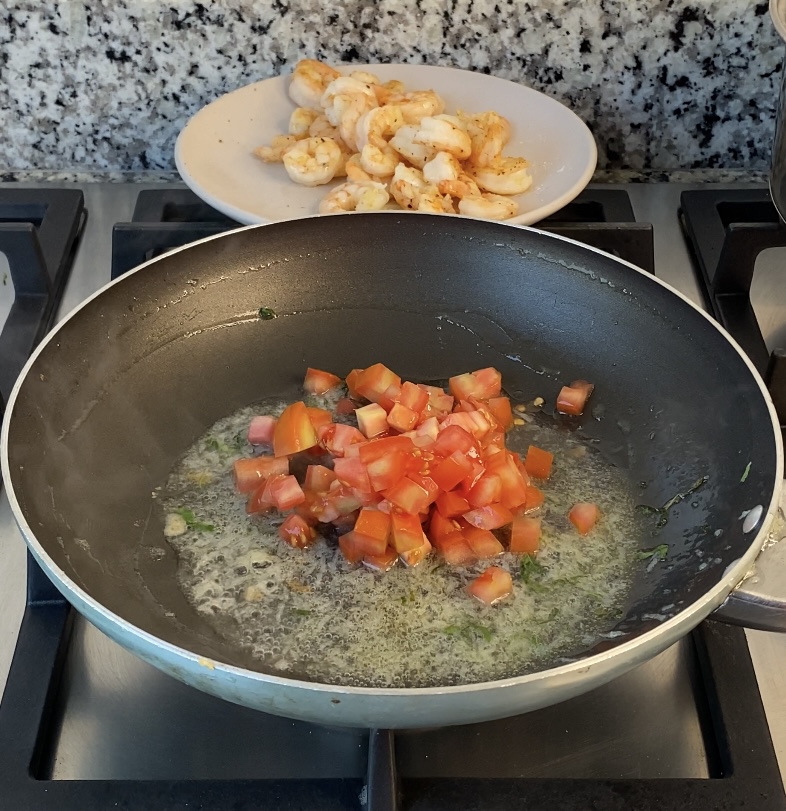 Bem, vamos aos ingredientes, fique a vontade para fazer substituições como o tamanho do camarão, tipo do tomate ou tipo de massa. Já substituições mais drásticas como usar orégano desidratado no lugar do manjericão ou não usar vinho, é por sua conta e risco!