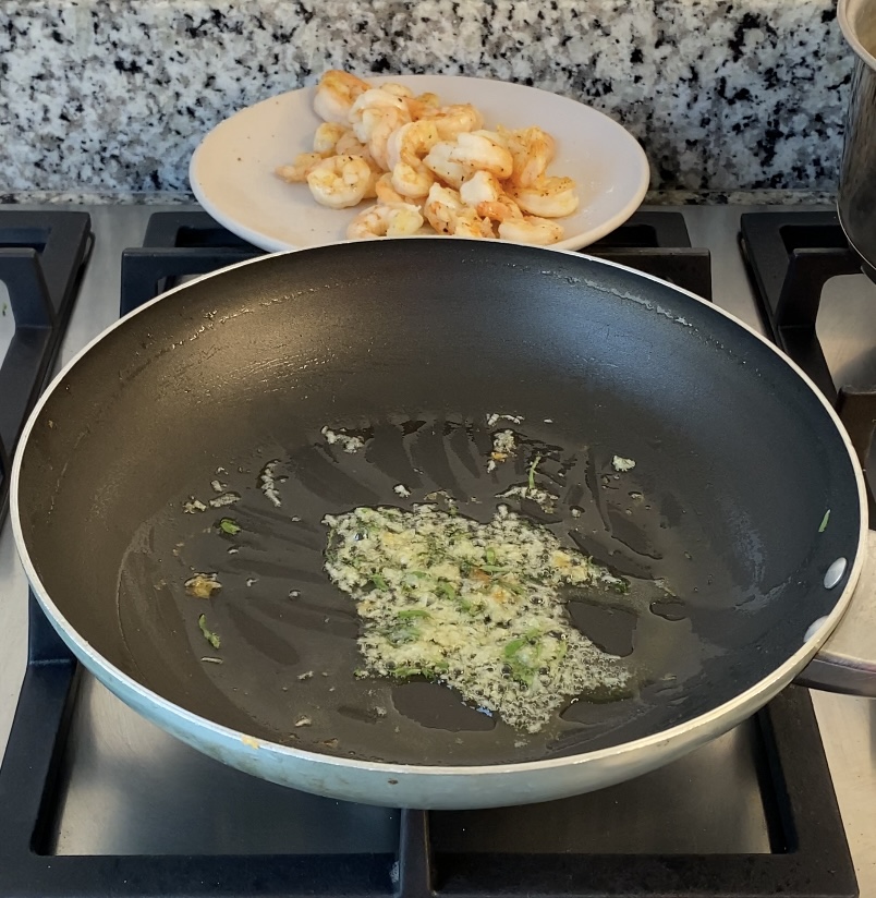 Nessa mesma frigideira, coloque um pouco mais de azeite, abaixe o fogo, acrescente o alho e o manjericão cortado, refogue até que comece a dourar.