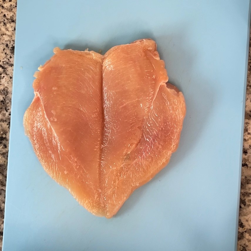 Agora corte o peito de frango, como se fosse fazer um bife mais sem atravessar por completo, para que fique parecendo um bifão quase que em formato de coração.