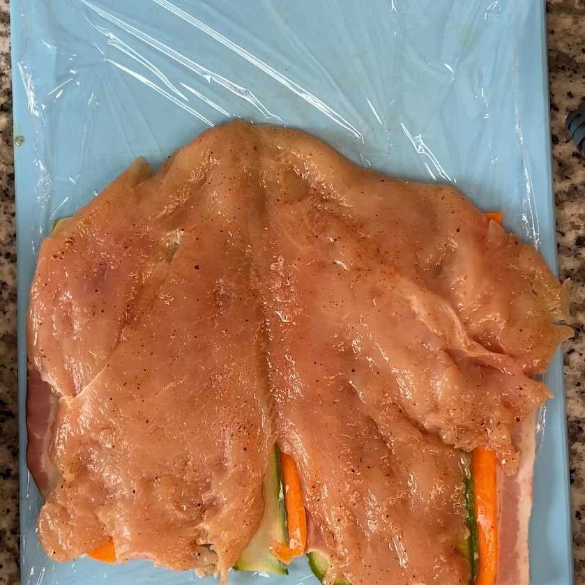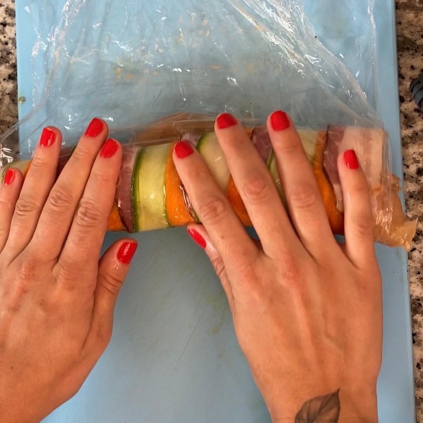 Forre uma superfície com plástico filme e vá fazendo fileiras intercalando o bacon, abobrinha e cenoura, até que fique da largura do frango. Coloque o frango sobre o intercalado de bacon e com o auxilio do plástico filme vá enrolando, formando um rocambole.