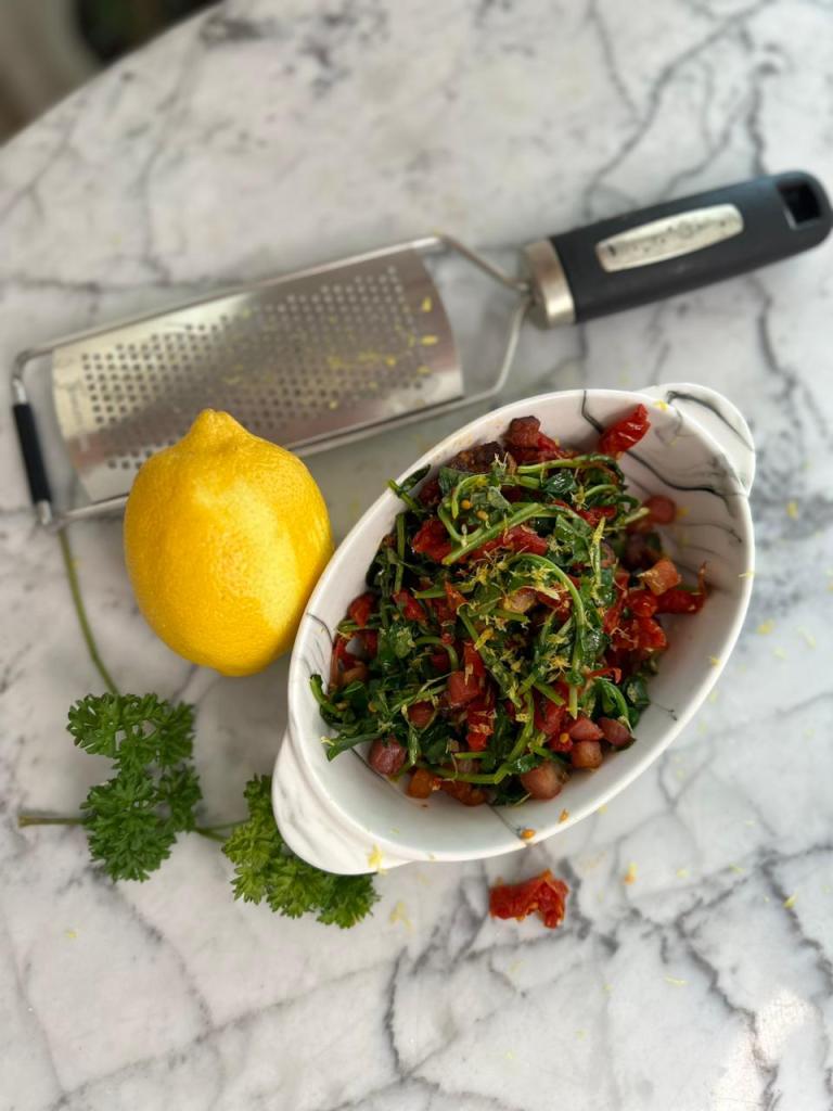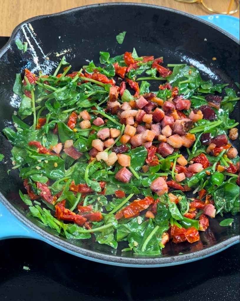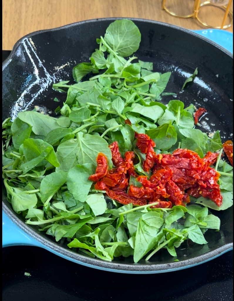 Acrescente o agrião e o tomate seco, aumente o fogo e misture tudo muito bem.