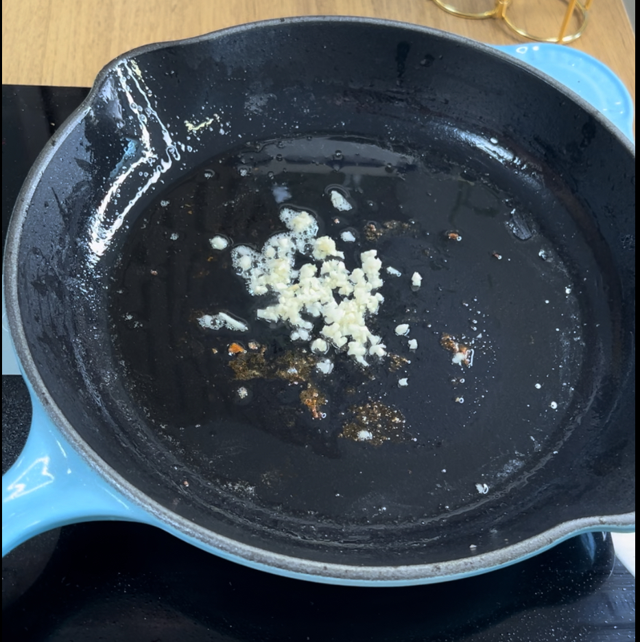 Na mesma frigideira, usando a gordura que o bacon soltou frite o alho em fogo baixo até ficar bem douradinho.
