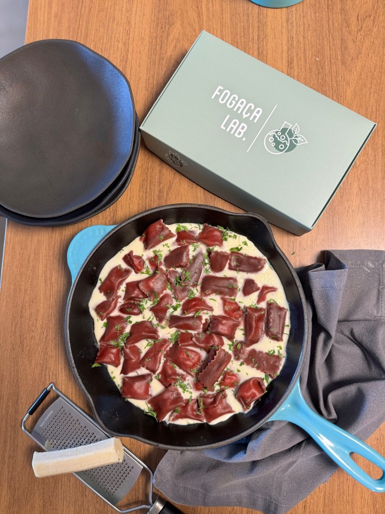 Farinha de trigo, ovos, azeite de oliva extra virgem, beterraba em pó, sal, ricota, limão siciliano, parmesão e fubá. CONTÉM GLUTÉN.
