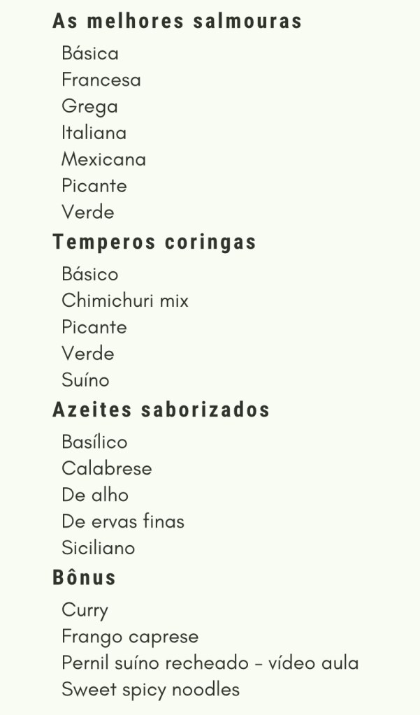 - Vou te ensinar mais de 40 receitas! Além das marinadas, você ainda vai aprender minhas salmouras favoritas, temperos coringas e azeites saborizados que irão transformar de uma vez por todas suas experiências na cozinha.
